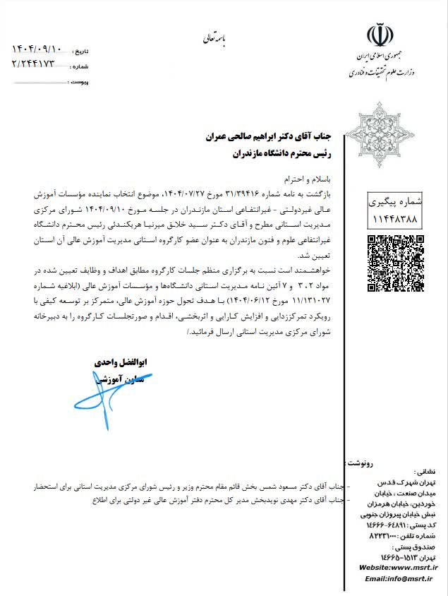 بر اساس این گزارش، طی نامهای به امضای دکتر ابوالفضل واحدی؛ معاون آموزشی وزارت عتف، با استناد به تصمیمات شورای مرکزی مدیریت استانی در جلسهی بهتاریخ 10 آذر 1404، دکتر سید خلاق میرنیا هریکندئی، رییس دانشگاه غیرانتفاعی علوم و فنون مازندران، به عنوان عضو کارگروه استانی مدیریت آموزش عالی غیردولتی استان مازندران تعیین گردید.