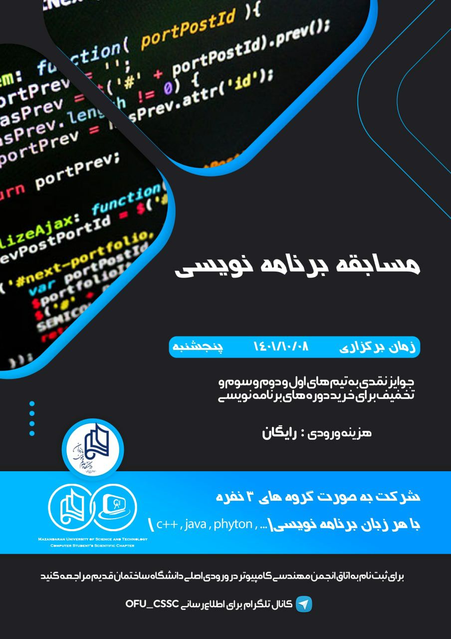 مسابقه کد نویسی مبهم در روز سوم اسفند ماه 1402، پنجمین مسابقه کد نویسی مبهم در محل صندوق نوآوری شکوفایی ریاست‌ جمهوری به میزبانی sharif-ict برگزار شد که در این مسابقه یک تیم دانشجویی از دانشگاه علوم و فنون مازندران شرکت کرده و توانستند رتبه پنجم این مسابقه را از میان چهل ..