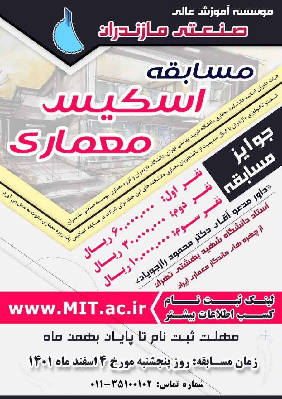 فراخوان طراحی تندیس کنفرانس بین‌المللی گروه کامپیوتر گروه معماری دانشگاه علوم و فنون مازندران از تمامی طراحان خلاق، هنرمندان، دانشجویان و علاقه‌مندان دعوت می‌کند در مسابقه طراحی تندیس ویژه کنفرانس بین‌المللی رشته کامپیوتر شرکت کنند. طرح تندیس باید بازتابی قدرتمند از خلاقیت، نوآوری، روح پژوهش و نگاه آی ..
